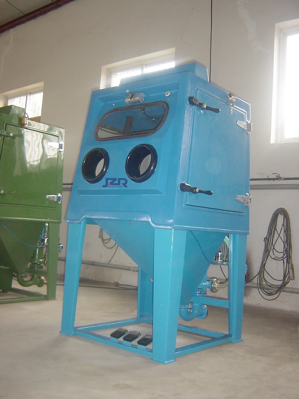 首先,液體噴砂機由磨液泵、水砂混合箱、攪拌裝置、噴射系統(tǒng)、控制系統(tǒng)機殼、自動化輔助系統(tǒng)等。磨液泵負責提供穩(wěn)定的水砂流,確?;旌弦旱某掷m(xù)供應;磨料混合箱配合攪拌系統(tǒng)為磨液泵提供水砂充分混合的介質(zhì)流,通過壓縮氣二次加速,形成均勻穩(wěn)定高速的的射流;噴嘴作為關鍵的噴射部件,負責將射流高速噴射到被加工表面上;機殼具備遮蔽及導流的作用,讓射流中的水及磨料快速轉(zhuǎn)移動混合箱中,從而讓噴射工作形成閉環(huán)。